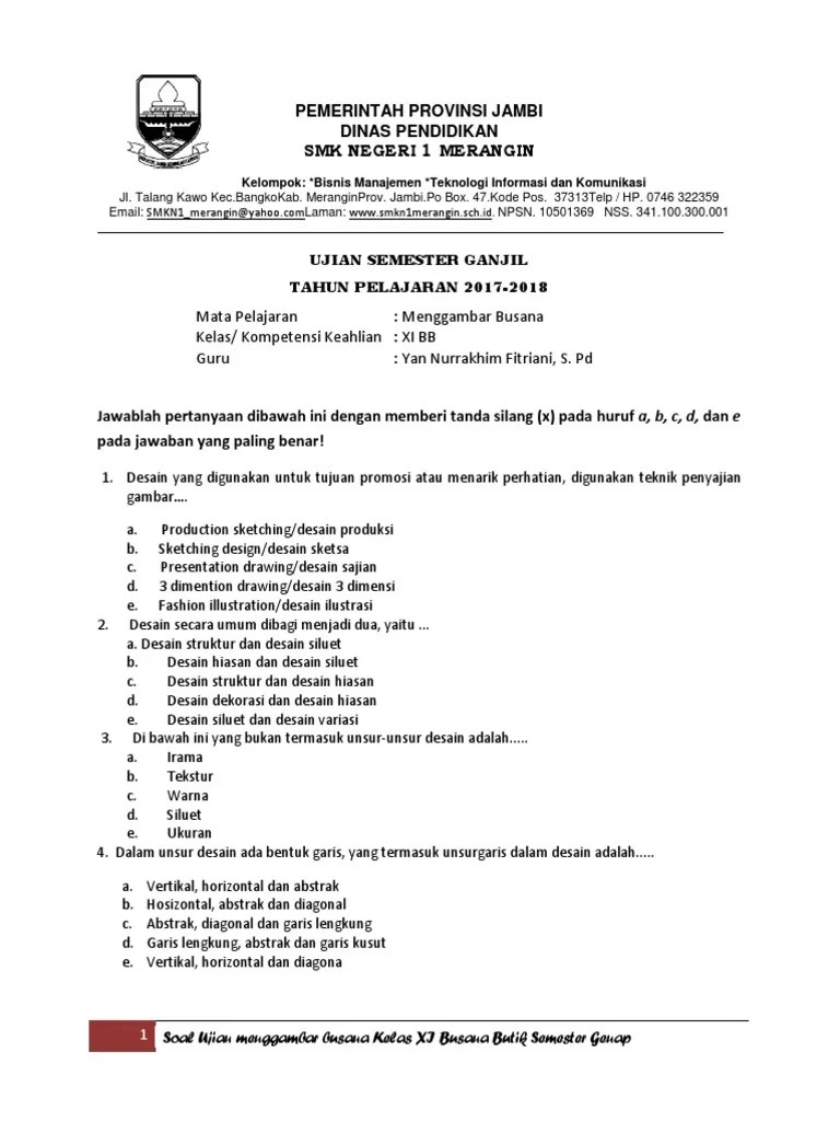 Lebihan kain yang berfungsi untuk menggabunkan bagian yang satu dengan bagian yang lainnya pada busana adalah… a. Untuk sekolah menengah kejuruan tata busana m i ra i n el n | we rni tata busana we | iz ti a aw rn e untuk smk direktorat pembinaan sekolah menengah kejuruan direktorat jenderal manajemen pendidikan dasar dan menengah departemen pendidikan nasional Itulah ringkasan materi mata pelajaran desain busana kelas xi jurusan tata busana semester ganjil maupun genap. Pembuatan kamisol (bustier) bab 3 : Penutup atau guntingan pada kain yang berfungsi memudahkan memakai atau melepas busana merupakan pengertian dari… a. Bilamana anda mengajar tanpa menggunakan rencana pelaksanaan pembelajaran tentu anda akan terasa ada yang hilang atau kurang sempurna sebab seperti berlayar di tengah samudera tanpa membawa kompas (hanya ibarat saja) sebetulnya walau tanpa rpp pun tapi jika anda sudah menguasai materi bisa saja proses pembelajaran berjalan dengan baik dan kompetensi yang diharapkan dapat tercapai. Rancangan bahan kamisol (bustier) bab 2 : Doc latihan soal produktif tata busana fashion drawing paket 1 lilik dyah academia edu soal desain busana kelas xi guru ilmu sosial soal dan kunci jawaban tata busana smk guru ilmu sosial soal uas kompetensi kejuruan kelas x doc soal pembuatan pola docx qurrata ayun academia edu soal tata busana soal desain busana kelas xi guru ilmu sosial Contoh soal desain busana kelas 10 beserta jawabannya. Silabus mata pelajaran desain busana satuan pendidikan : Sebagai salah satu sumber belajar peserta didik kelas x jurusan tata busana di jenjang sekolah menengah kejuruan (smk). Buku dasar desain bidang keahlian pariwisata program keahlian tata busana smk mak kelas x shopee indonesia. Soal essay desain grafis kelas 10 guru ilmu sosial.